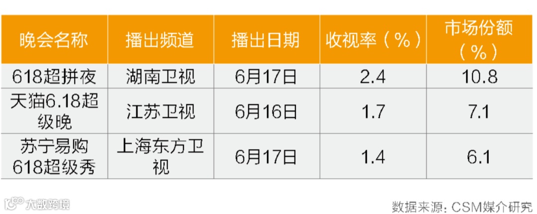 2020年的“6.18”晚会掀起了全年电商晚会的第一个高潮。其中湖南卫视的《618超拼夜》收视率2.4%,同时段市场份额10.8%。上海东方卫视的《苏宁易购618超级秀》收视1.4%,同时段市场份额6.1%。江苏卫视提前一天播出的天猫晚会收视率1.7%,同时段份额7.1%。