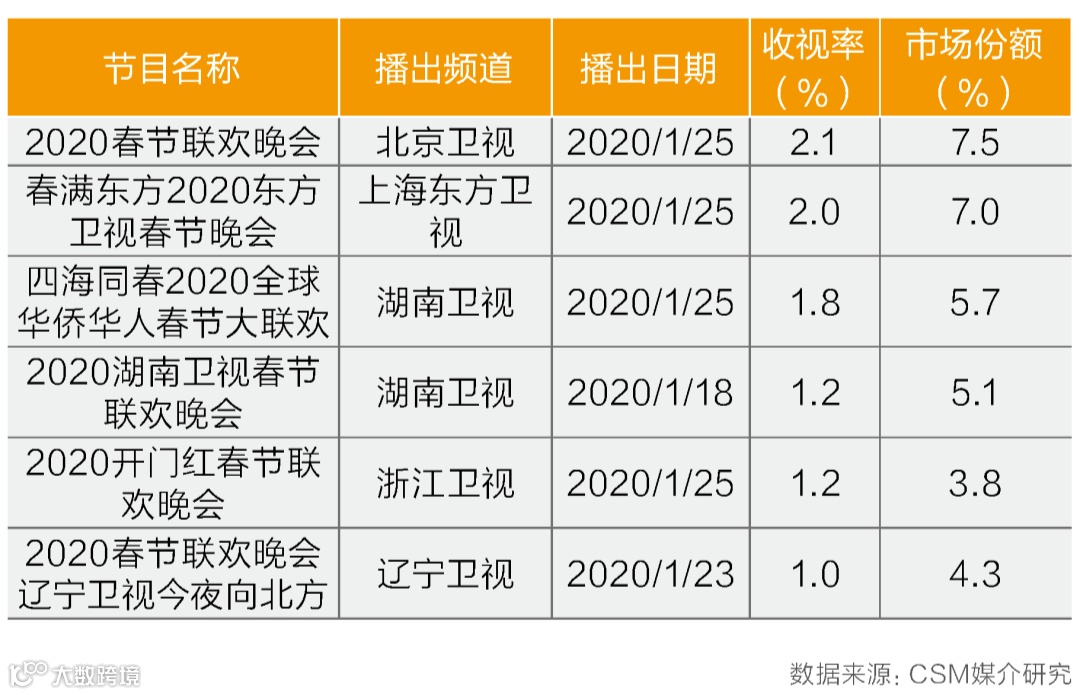 中央台三套2020年1月25日大年初一推出喜剧晚会《新春喜剧之夜》,晚会邀请了众多影视演员、主持人、歌手等跨界出演喜剧,节目首播收视率2.3%,同时段市场份额7.0%。1月26日大年初二推出的《新春相声大联欢》也主打跨界特色,以全新的节目模式与视角,展现相声这一传统民间艺术,与观众共迎新春佳节,节目首播收视率2.0%,同时段市场份额5.9%。