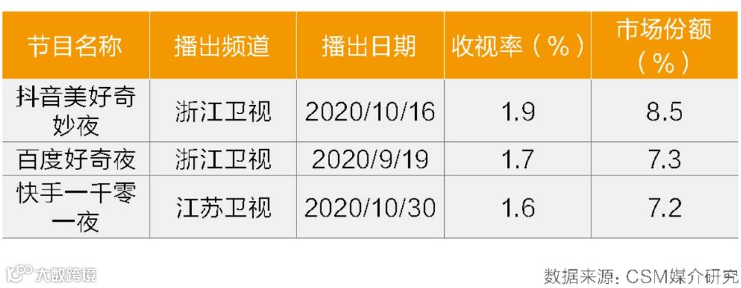 2020年移动互联网头部平台公司纷纷与省级上星频道合作推出品牌晚会,其中浙江卫视2020年10月16日播出的《抖音美好奇妙夜》收视率1.9%,同时段市场份额8.5%;9月19日播出的《百度好奇夜》收视率1.7%,同时段市场份额7.3%;10月30日,江苏卫视与快手合作的《快手一千零一夜》收视率1.6%,同时段市场份额7.2%。