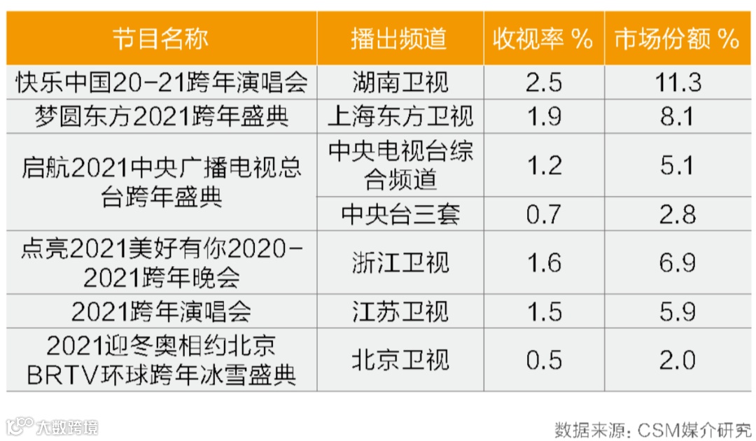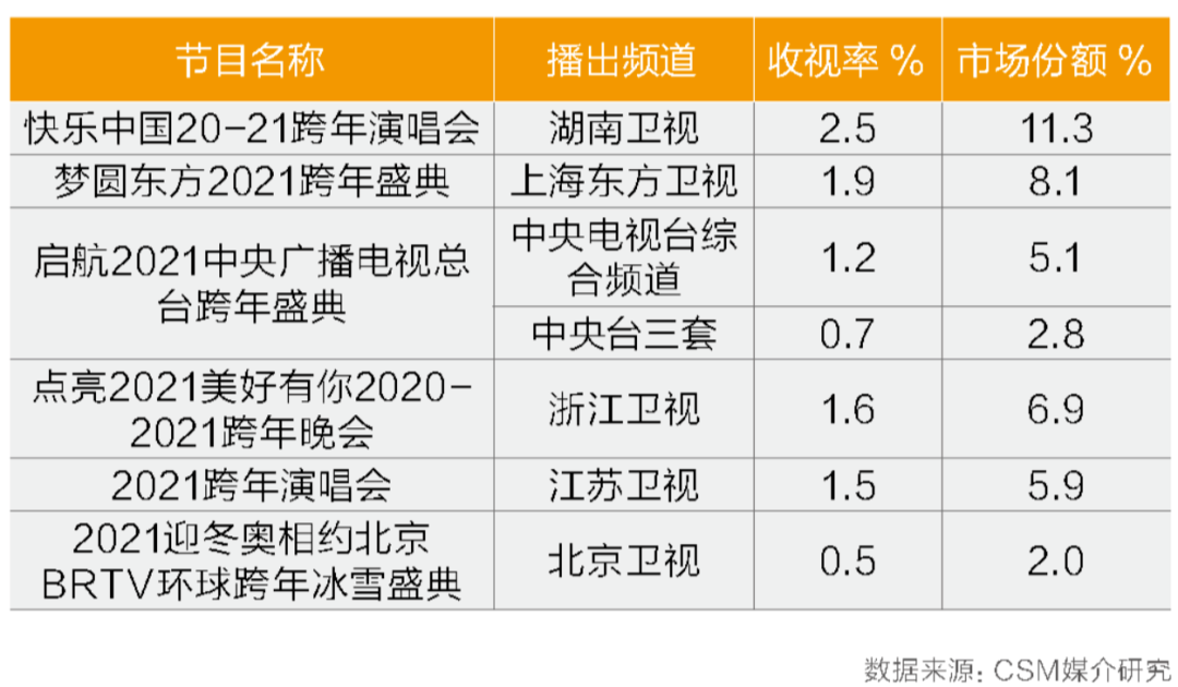 2020年观众收看跨年晚会的热情不减,其中,湖南卫视跨年晚会收视率为2.5%,同时段市场份额11.3%;上海东方卫视跨年晚会收视率为1.9%,同时段市场份额8.1%;中央电视台综合频道和三套并机播出的《启航2021中央广播电视总台跨年盛典》两频道并机总收视率为1.9%;浙江卫视跨年晚会收视率为1.6%;江苏卫视跨年晚会收视率1.5%;由北京卫视牵头,八台九星联合播出了《环球跨年冰雪盛典》,在北京卫视的收视率为0.5%。