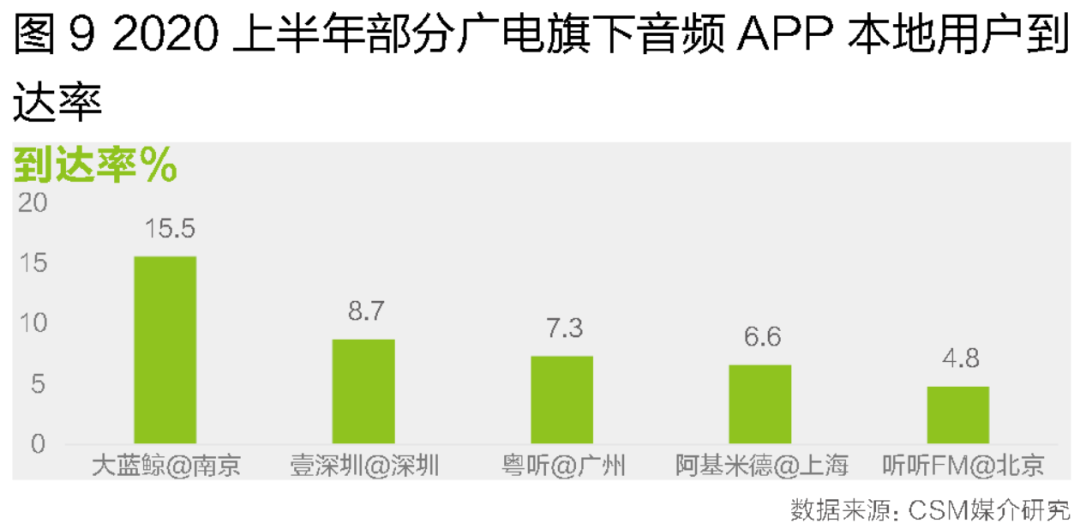 相比于蜻蜓FM、喜马拉雅FM等商业化音频APP,广电媒体旗下的APP目前的差距主要体现在用户(听众)规模上。2020上半年,除了大蓝鲸在本地听众中的到达率为15.5%外,壹深圳、粤听、阿基米德和听听FM的本地到达比例均未超过10%。这与蜻蜓FM在8城市平均22.2%和喜马拉雅FM16.6%的到达比例还有相当大的差距(图9)。