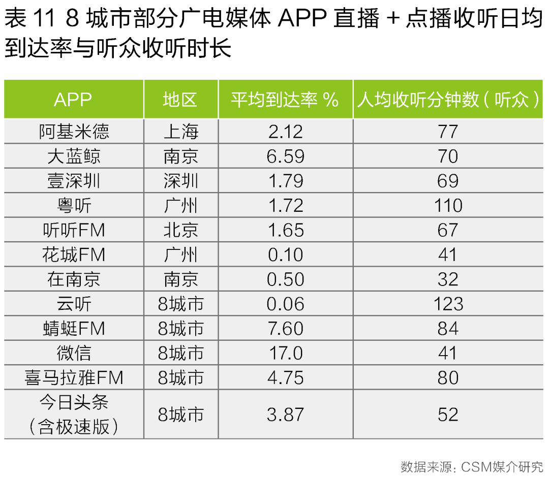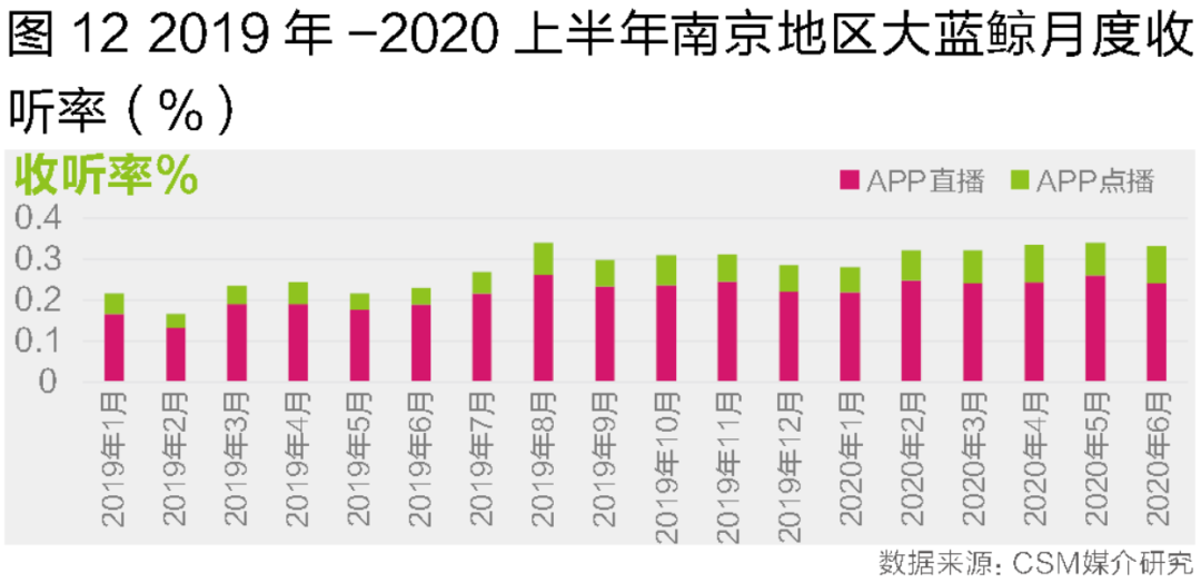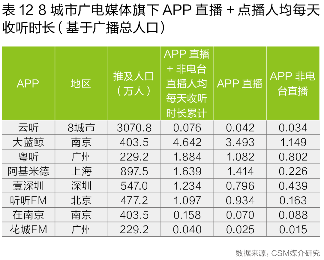 广电媒体旗下的音频APP也在根据自身的发展现状进行直播与点播内容的布局。比如大蓝鲸在南京地区每天除了人均约3.5分钟(基于南京调查区域整体403万的广播推及人口)的APP直播收听外,还有人均超过1.1分钟的APP点播内容收听时长。粤听在本地的APP直播收听时长为1.9分钟,在APP点播上的收听量也达到了0.8分钟。从APP直播与非直播内容的比例分布看,粤听中非直播内容收听时长所占比重超过42%(表12)。