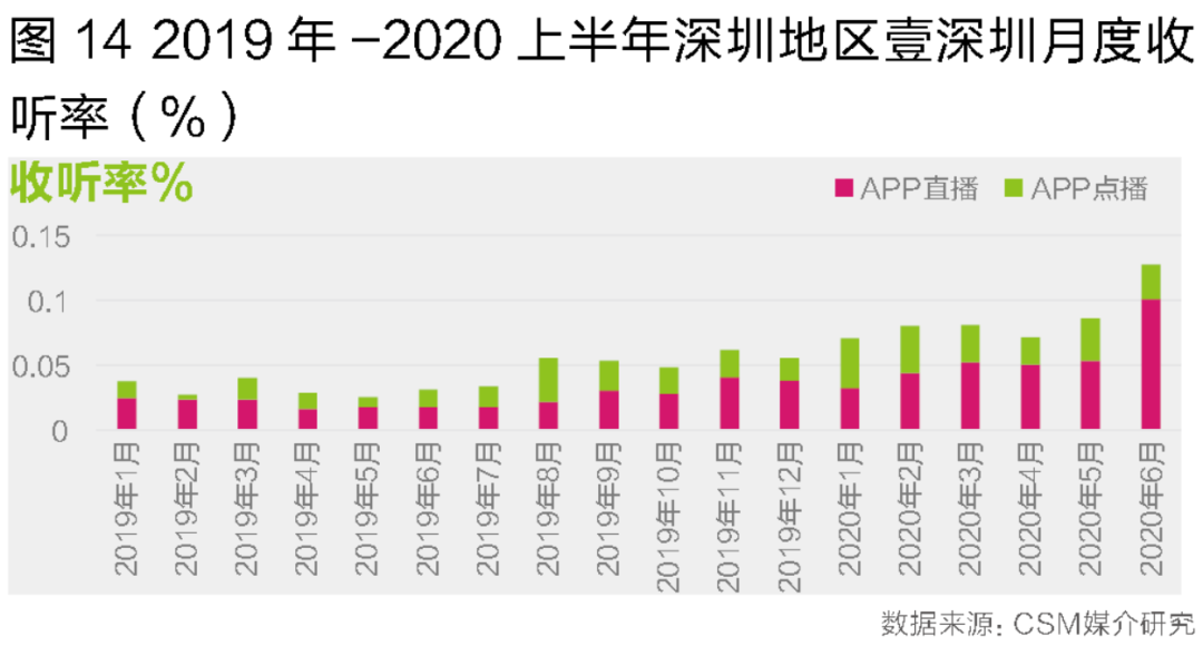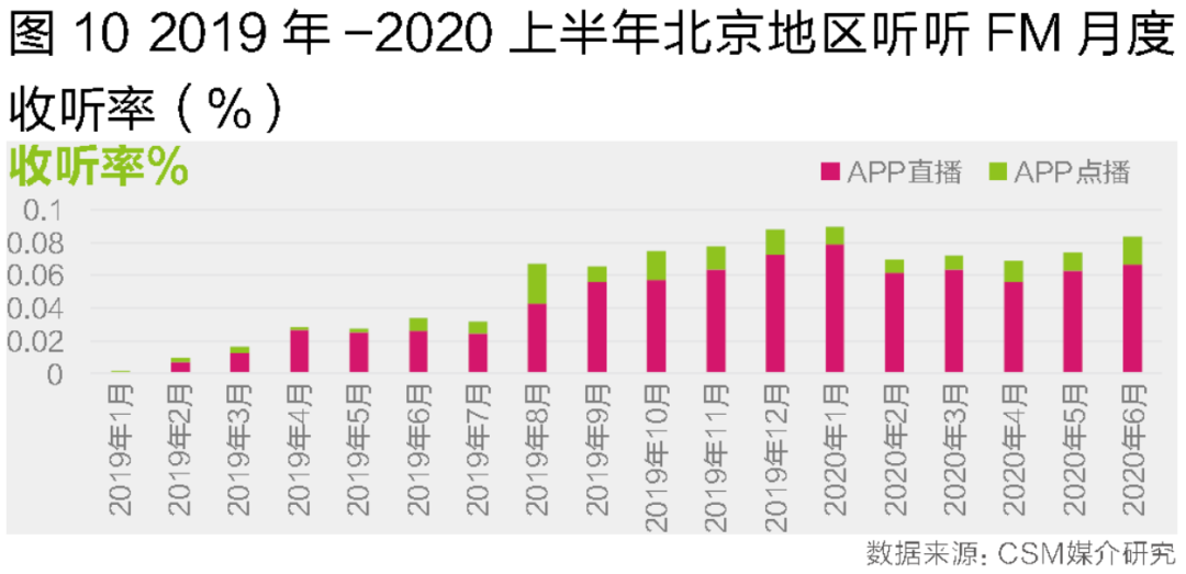 对于广电旗下的音频APP来说,拓展新用户是一个长期持续的过程。许多广播电台也在节目中大力推广自家的音频APP并取得了不错的效果。比如2020上半年听听FM和壹深圳两个APP的本地用户规模相比2019下半年涨幅均超过20%。在日均用户规模上,听听FM在北京的平均到达率从2019下半年的1.31%增长到2020上半年的1.65%,壹深圳在深圳则是从1.47%增长到1.79%。