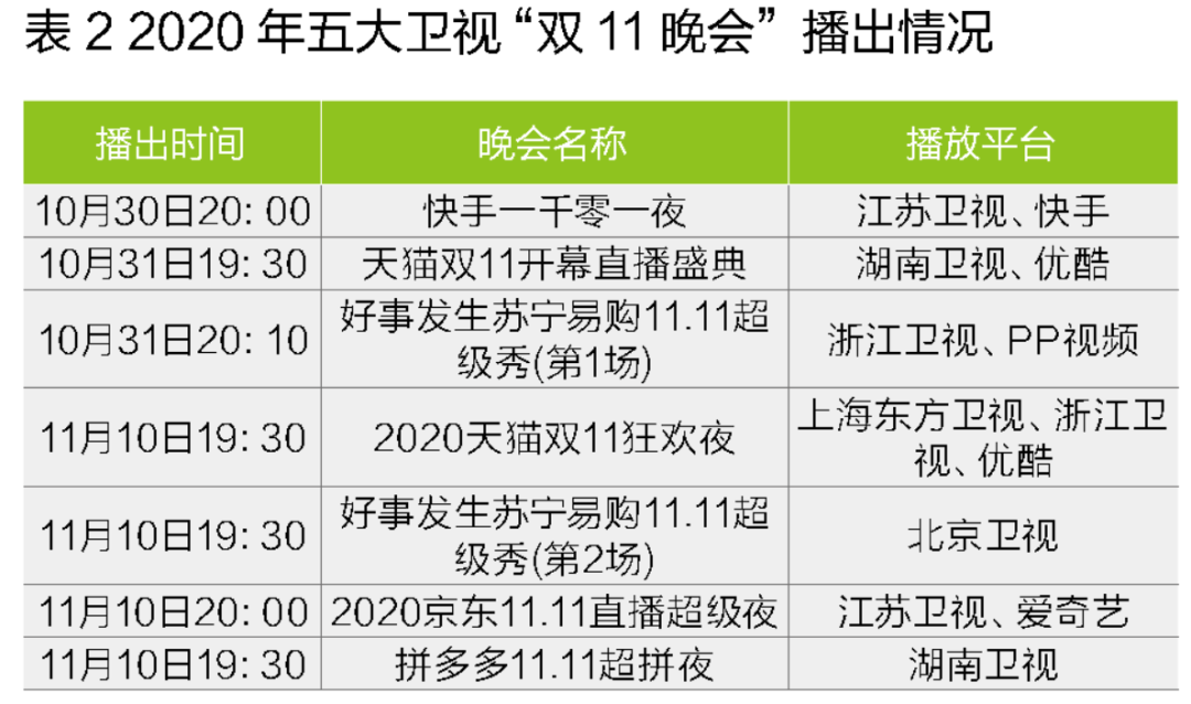 从跨年晚会、春节晚会、元宵晚会到中秋晚会等,各大卫视在晚会上的竞争一直不断,不仅拼明星阵容,还要拼话题热度和出圈效果。2015年起,又多了一场兼具带货功能的晚会——“天猫双11狂欢夜”,自此,各大电商平台抓住各种购物节契机纷纷入局,不仅在线上发起优惠促销活动,还谋求与电视台合作,共同推出带货综艺晚会,把综艺内容、明星游戏、移动购物融于一体,通过多屏互动,重构“消费+娱乐”的新模式。