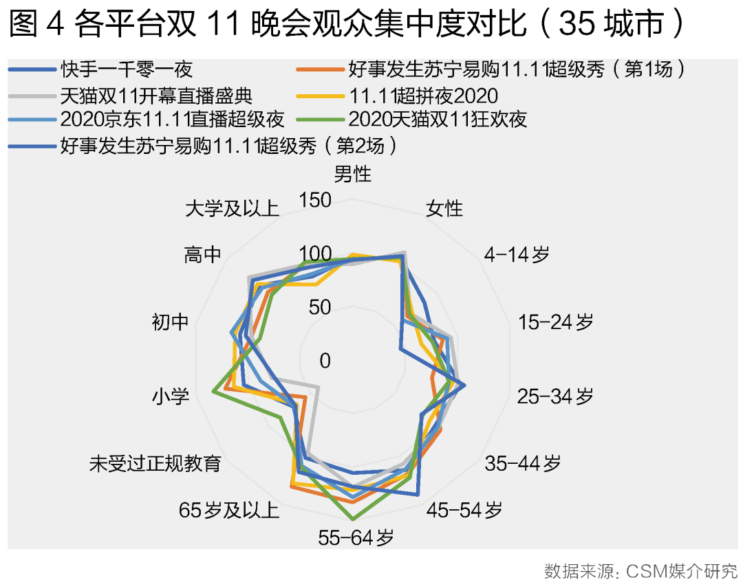 这3台晚会只是一个热身,11月10日晚才是一场空前的“鏖战”——共有4场大型晚会同时举办,包括京东联合江苏卫视、拼多多联合湖南卫视、苏宁联合北京卫视、天猫携手上海东方卫视和浙江卫视,表演阵容几乎囊括了时下娱乐圈炙手可热的所有明星。全明星也吸引了多元化的收视观众,从数据上看,45岁及以上的各年龄段人群集中度均高于100%,《快手一千零一夜》《天猫双11开幕直播盛典》《好事发生苏宁易购11.11超级秀(第2场)》更是受到25-34岁人群的喜爱(图4)。