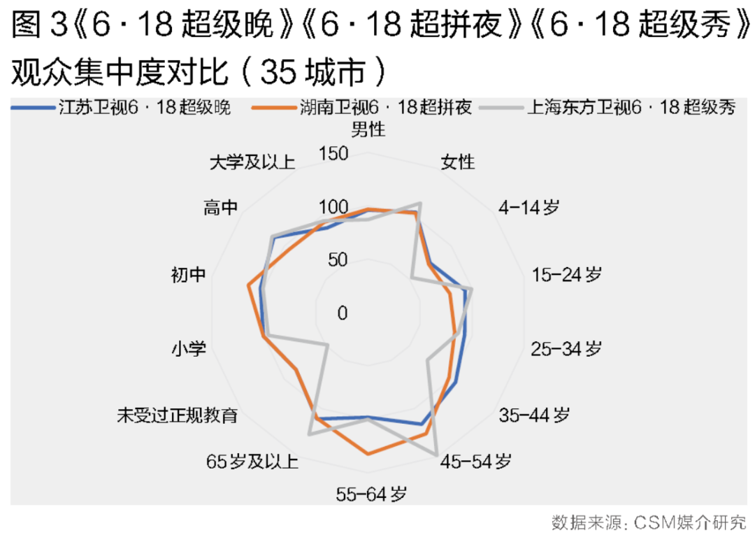 对比以上三挡带货综艺晚会的观众集中度情况可以看出,重度观众大致是相似的,普遍在女性观众,中青年观众以及中高学历观众群中更受欢迎(图3)。