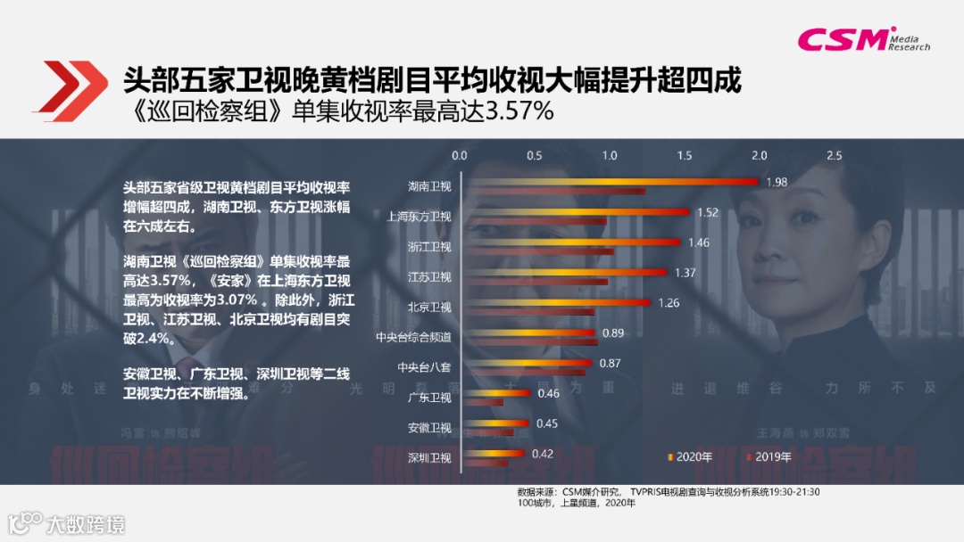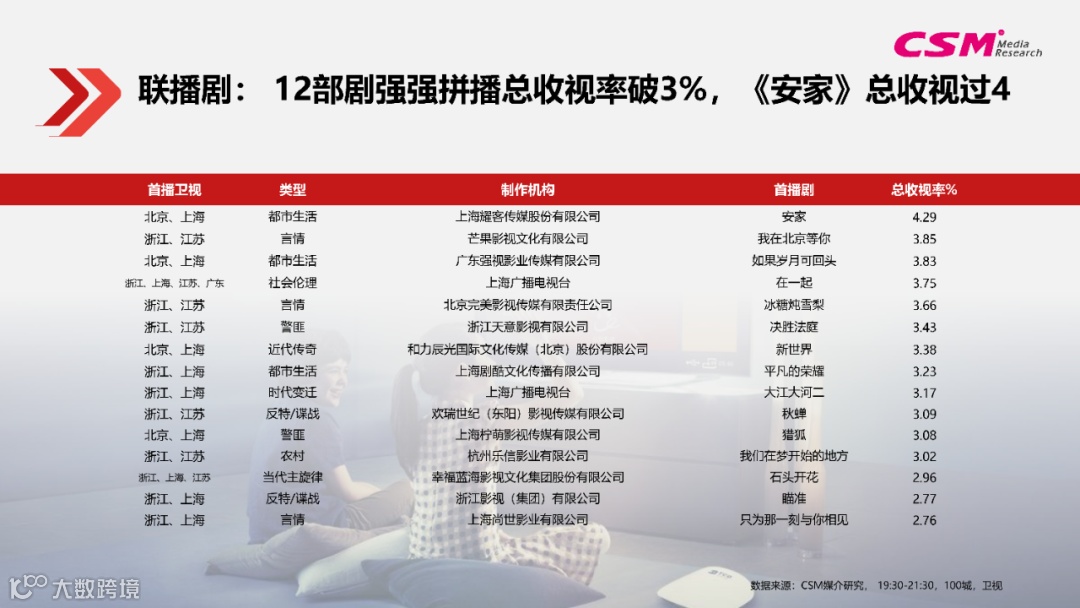 在剧集收视水平上,湖南卫视7部独播剧平均收视过2,《巡回检察组》在湖南卫视单集收视率最高达3.57%。同时,优质剧集在联播加持下收视热度进一步扩大,12部剧强强联播总收视率破3%。其中《安家》总收视过4,该剧在上海东方卫视单集最高收视率为3.07% 。除此外,浙江卫视、江苏卫视、北京卫视均有剧目单集突破2.4%。