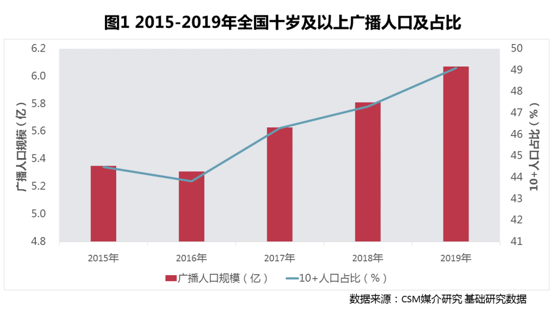 CSM近年来的基础研究数据显示,全国范围内10岁及以上的广播人口持续稳定上涨,从2015年的5.35亿上升至2019年的6.07亿,五年间增长7200万,升幅达13.5%(图1)。