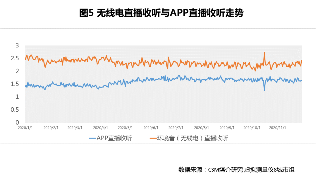 目前承载广播节目传输的主要有无线电传输(AM/FM)和互联网(主要是移动互联网)。CSM的测量仪数据显示,通过无线电广播(AM/FM)为主的收听变得愈来愈弱,而通过手机APP收听广播节目的行为越来越多(图5)。