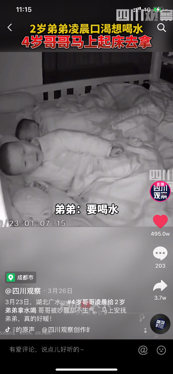 《四川观察》3月10日发布的短视频#4岁哥哥凌晨给2岁弟弟拿水喝