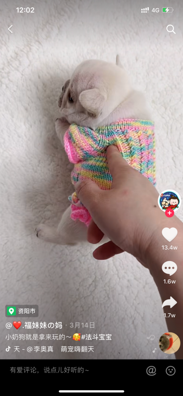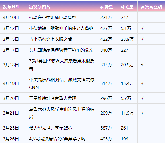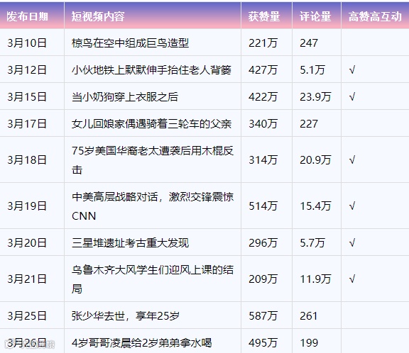 宠物类视频是短视频平台上高吸引类的视频类别之一。这条短视频获得422万赞、23.9万的评论量,是3月互动综合排名第一的短视频。