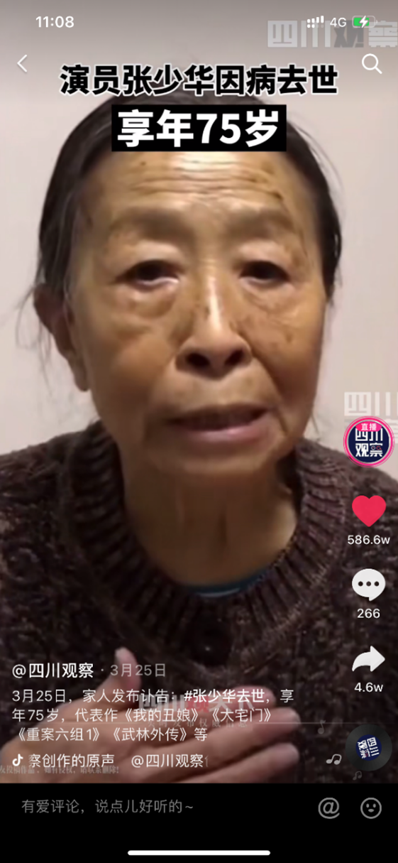 第二段4秒,剪辑了其经典影视片段“给你送钱来了”并配上字幕“张少华从艺近60年 出演了《大宅门》《五月槐花香》《我的丑娘》《铁梨花》等影视作品。