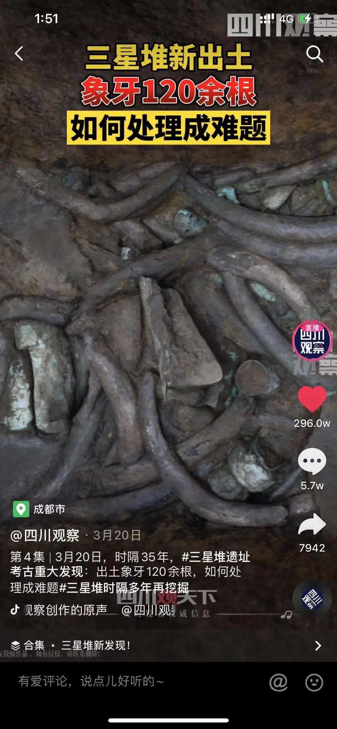 《四川观察》3月20日发布的短视频#三星堆遗址考古重大发现:出土象牙120余根,如何处理成难题
