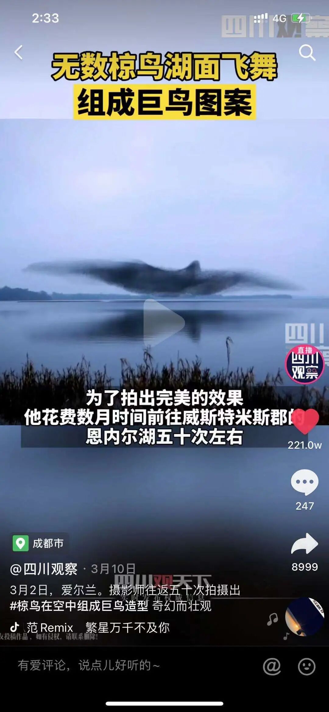 四川观察账号短视频的置顶文字标题,总是非常的言简意赅。置顶文字标题“无数椋鸟湖面飞舞组成巨鸟图案”,不仅使得受众快速了解视频内容,而且打开短视频后就下意识着等着巨鸟图案的出现。