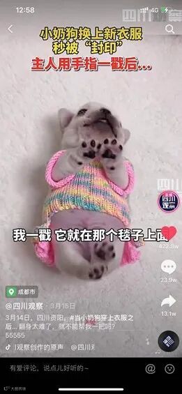 《四川观察》3月15日发布的短视频#当小奶狗穿上衣服之后….翻身太难了
