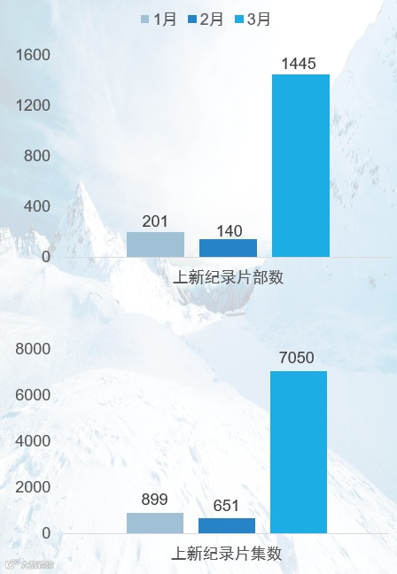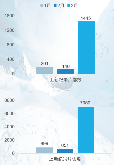 一、五大视频网站第1季度上新纪录片1786部,超过去年统计总量(1370部),其中三月份上新量显著增加。