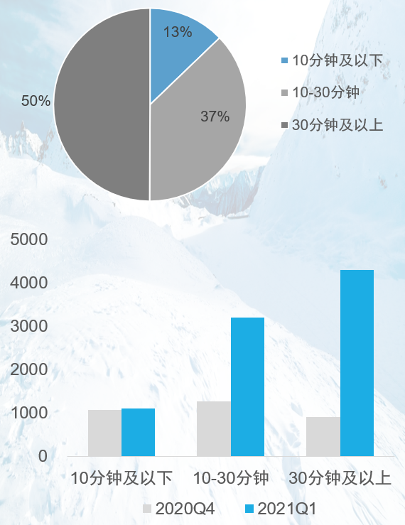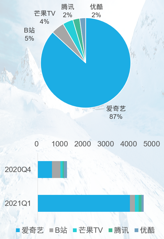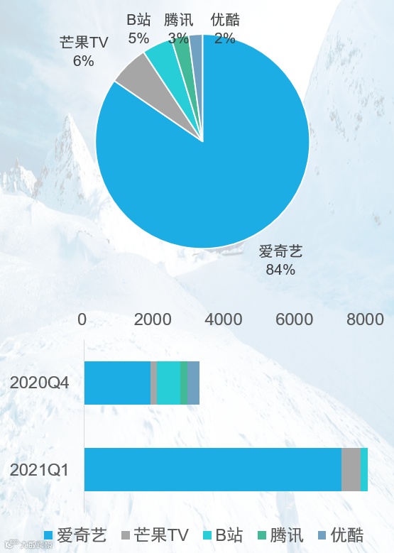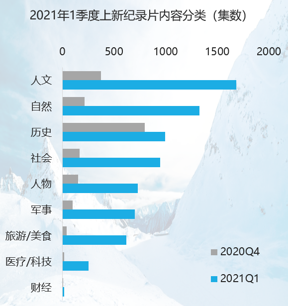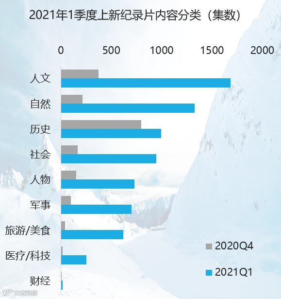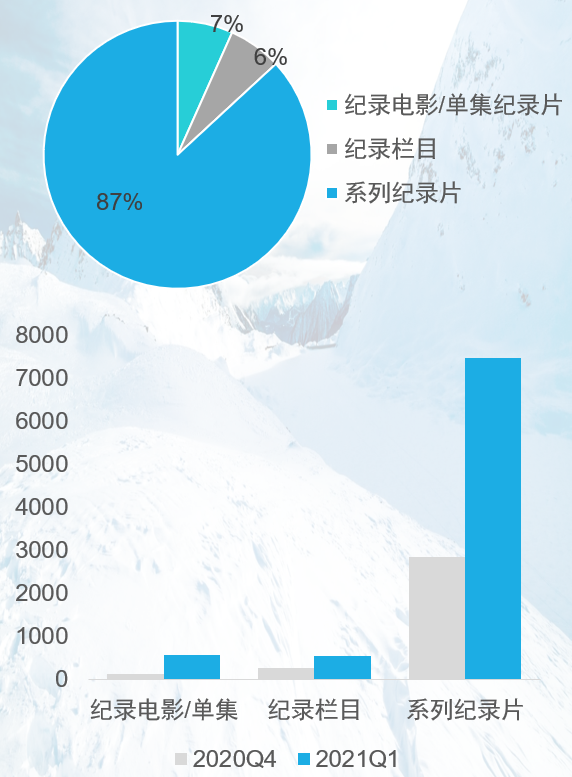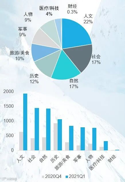 统计数据中,爱奇艺平台在2021年1季度(主要集中在3月)上新了大量纪录片内容,共计7000余集,总时长超过4000小时,几乎与去年5个平台纪录片总量相当。上新内容中,人文、自然类内容占比较高,此外,各纪录片影展的参展内容集中上线。
