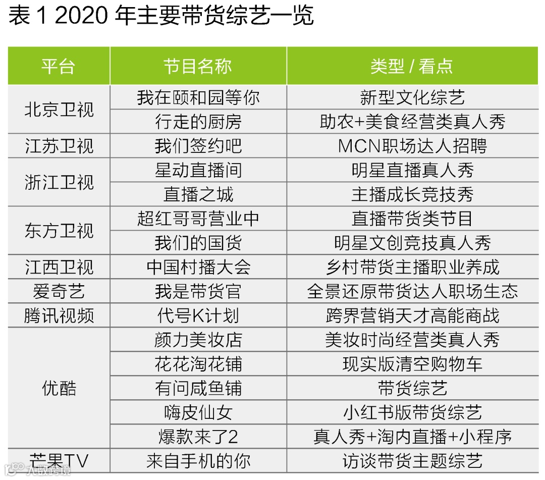 带货综艺一方面凭借明星们的宣传助力,刺激了观众消费的动力;另一方面,观众在观看综艺的过程中,更容易冲动消费。基于以上优势,2020年诸多带货综艺在各大视频平台扎堆推出,成为去年综艺市场一大特色(表1)。
