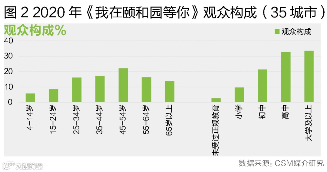 与其他直播平台主播们反复强调带货的商品是“全网最低价”“大家都在买”不同,这次直播间明星们带货的产品,多以新国风类的商品为主,而这类商品给人的感觉是不能用钱来衡量的,营造出的是“不以带货为主”的直播氛围。比如说,浓缩了端午文化的粽子、自带优美传说的酒水、各具特色的颐和园新文创、古风犹存的水墨屏手机等,明星主播们通过巧妙的情节设计和一步一景的场景穿插,在“颐和园”古朴古香的属性之外,赋予它们更多潮流前卫的外延,力求打造一种独特的“颐式”文化消费场景。作为一档文化类综艺节目,节目在大学及以上高学历人群中获得了最高收视时长回报,此外,25-54岁观众构成最高(图2)。
