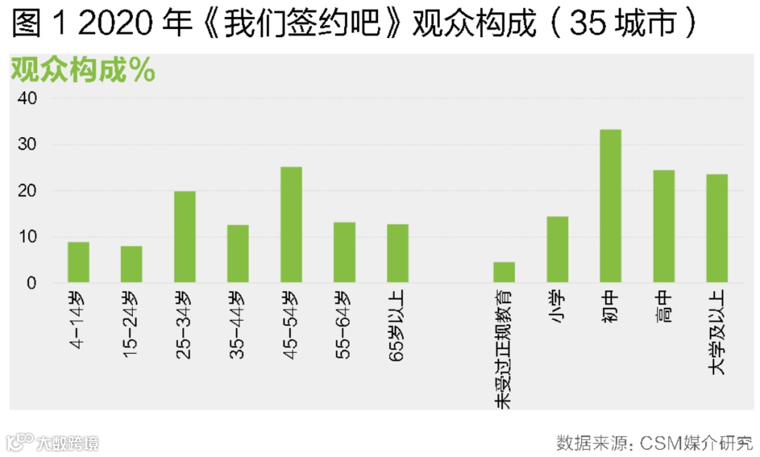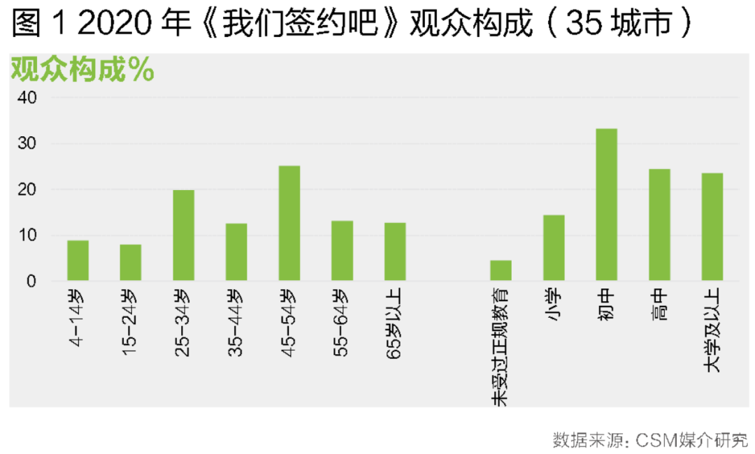 在选手方面,《我们签约吧》汇集了风格各异的花样主播达人,女团型、段子型、励志型等等,齐聚一堂大显身手,他们不但是实力在线的直播带货高手,有些甚至是拥有百万级粉丝的人气网络达人。观众会发现,大家挤破头都想进入的直播行业,其实远不是想象中那么简单,甚至会有选手在节目中展示“盲猜白酒”的逆天技能。此外,节目中的一对选手——电商直播情侣豆豆和梦身患残疾,两人通过网络结缘,并凭借坚强的意志在直播行业努力打拼,承受着常人无法理解的艰辛,而他们一路互相鼓励支持,用爱守护着彼此,向观众传递出满满的正能量,令嘉宾们为之动容。可以说,《我们签约吧》将直播带货与传统职场综艺所传递出的那种拼搏奋斗与日积月累的精神巧妙结合在一起。从观众构成与集中度数据上来看,这个节目也是十分契合其定位,不光是45-54岁中青年观众,节目在25-34岁观众人群中也获得了不错的收视回报(图1)。