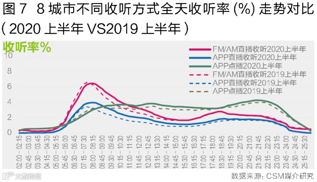 无论FM/AM直播收听还是APP直播收听都呈现出早高峰的收听形态,而APP非直播内容的收听在全天则呈现出平稳分布的形态。与2019年同期相比,FM/AM直播收听在早晨至上午时段提升较多;手机APP直播收听在白天时段都有所增长,其中早晨至上午时段的涨幅更为明显;APP非直播内容的收听在全天各时段普遍提升(图7)。