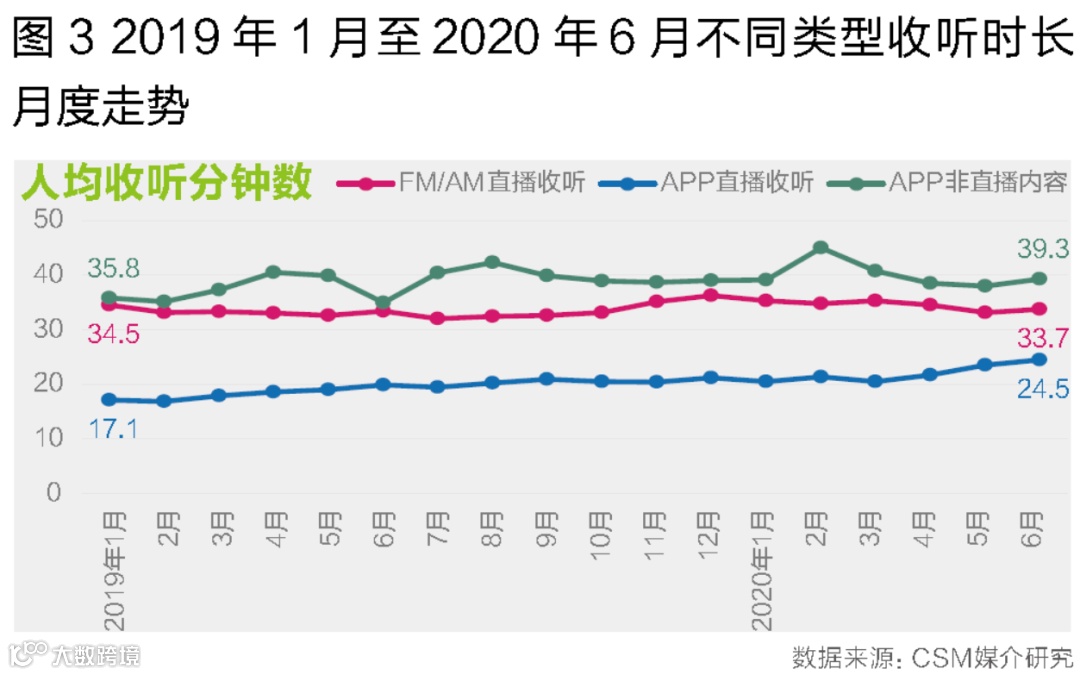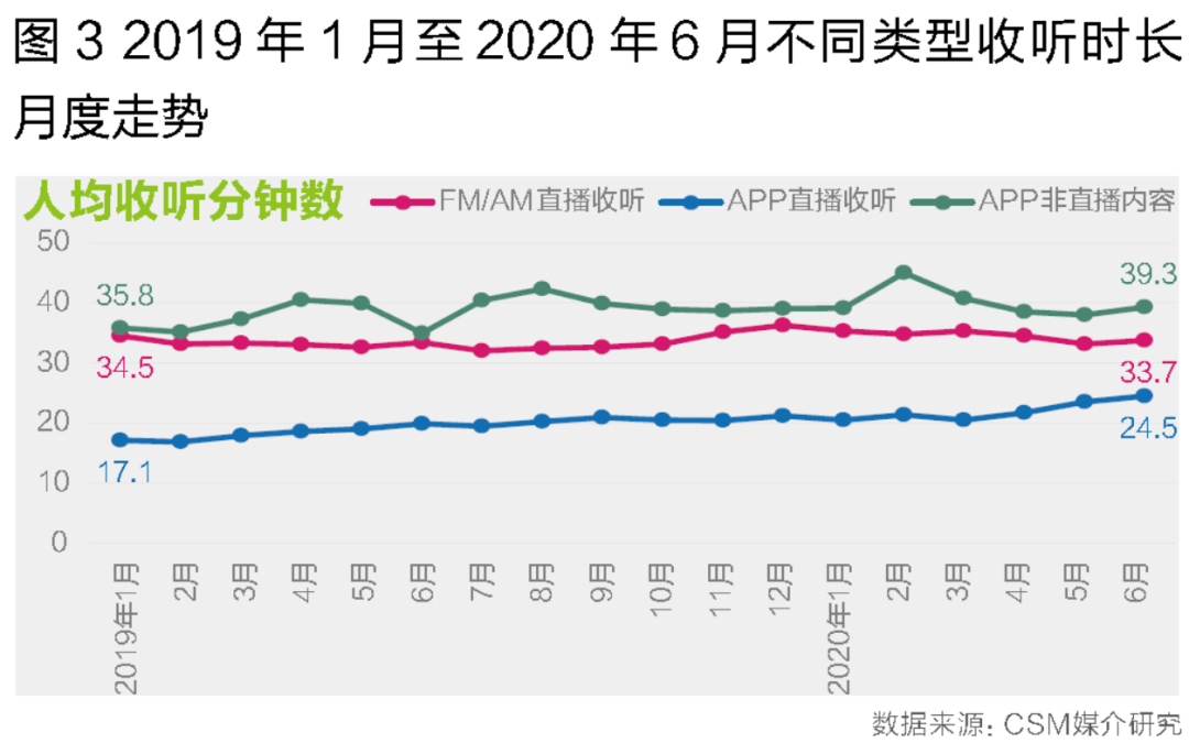 从收听时长的分月走势上看,最值得关注的是用户使用手机APP收听广播直播内容的时长在2020年上半年持续提升,该比例已经从2019年1月的17.1分钟增长到2020年6月的24.5分钟,增幅达43%(图3)。