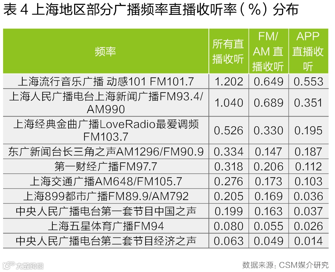 上海地区听众收听的主要直播频率中,上海流行音乐动感101在FM/AM直播收听稍微落后于上海新闻广播,但凭借在手机APP直播收听的优势使得总收听率反超。东广新闻长三角之声的直播收听中,来自手机APP的比例达到56%(表4)。