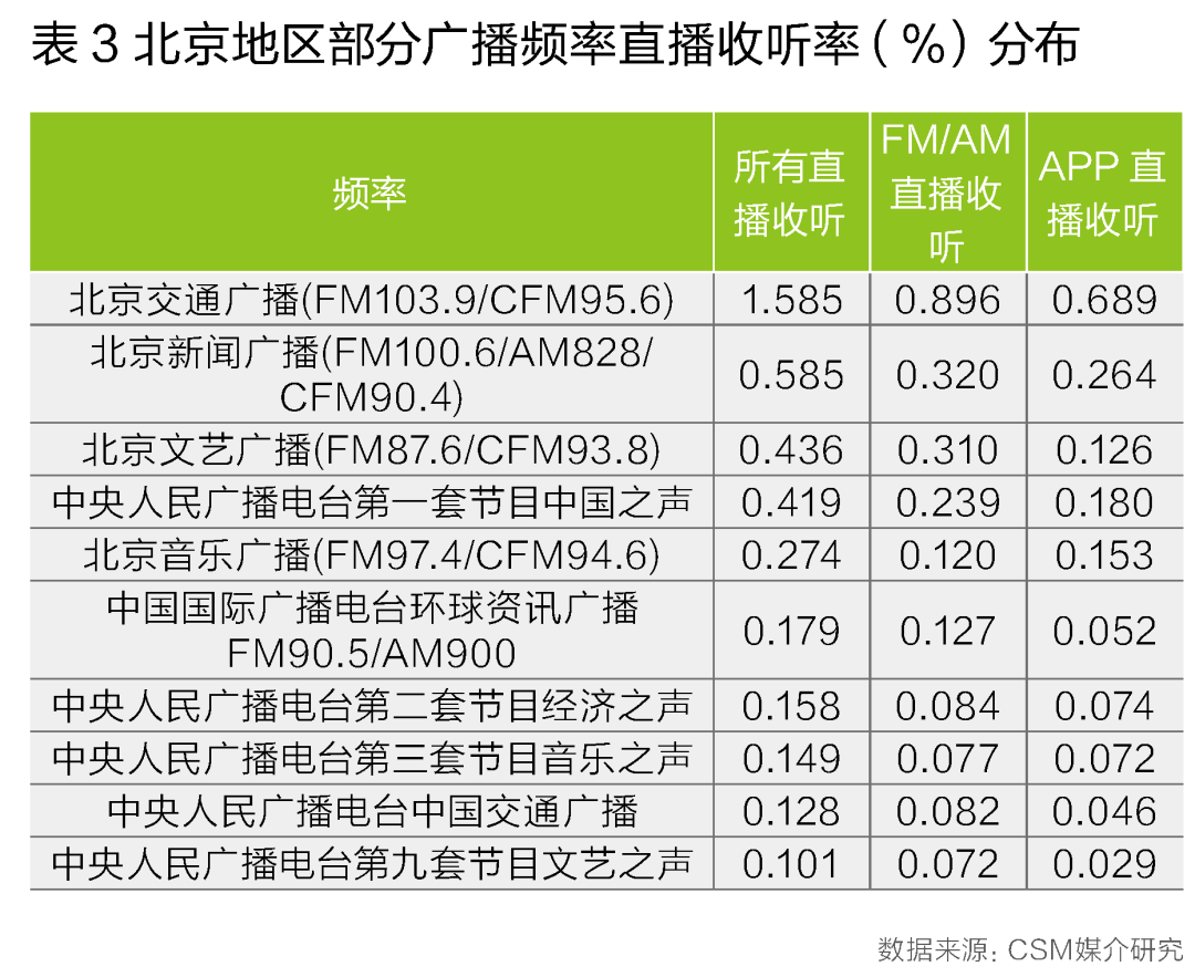 北京地区听众收听的主要直播频率中,北京交通广播在FM/AM直播收听和手机APP直播收听中都占据绝对领先的位置。北京音乐广播直播收听中,来自手机APP的比例达到56%,是唯一一个APP直播收听占比高于FM/AM直播收听的频率(表3)。
