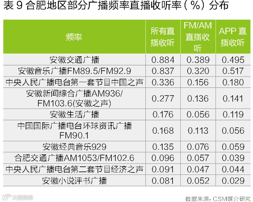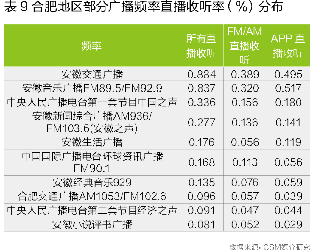 合肥地区听众收听的主要直播频率中,安徽交通广播在FM/AM直播收听中处于领先位置,但在手机APP直播收听中,安徽音乐广播竞争力更强。各主要频率中,安徽生活广播、安徽音乐广播、安徽交通广播、中国之声和安徽之声来自手机APP的比例均较高,分别为68%、62%、56%、54%和51%(表9)。