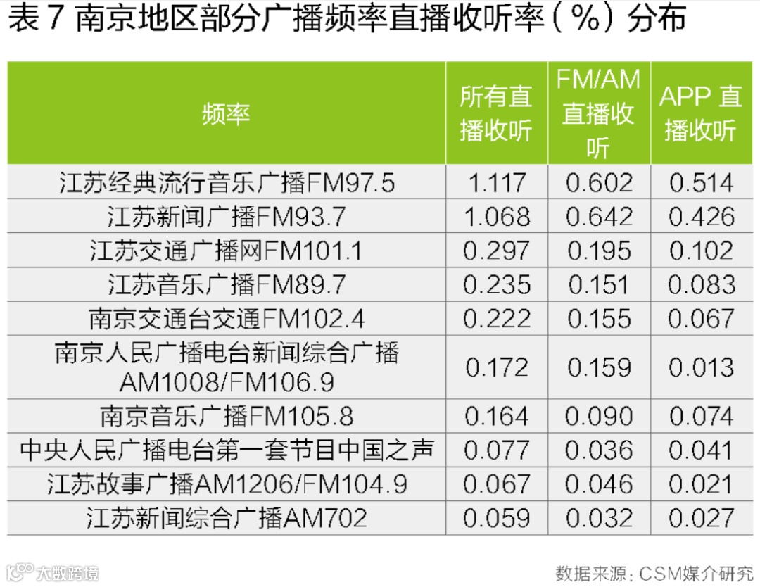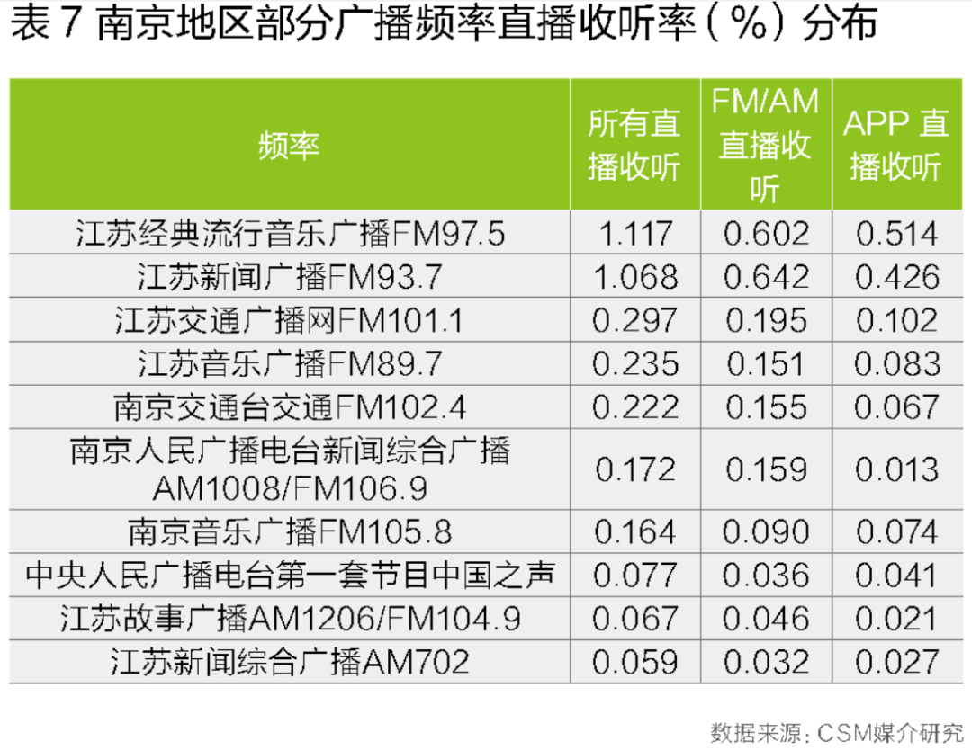南京地区听众收听的主要直播频率中,江苏经典流行音乐广播在FM/AM直播收听稍微落后于江苏新闻广播,但凭借手机APP端的领先优势实现反超。各主要频率中,来自手机APP直播收听占比超过50%的是央广中国之声(表7)。