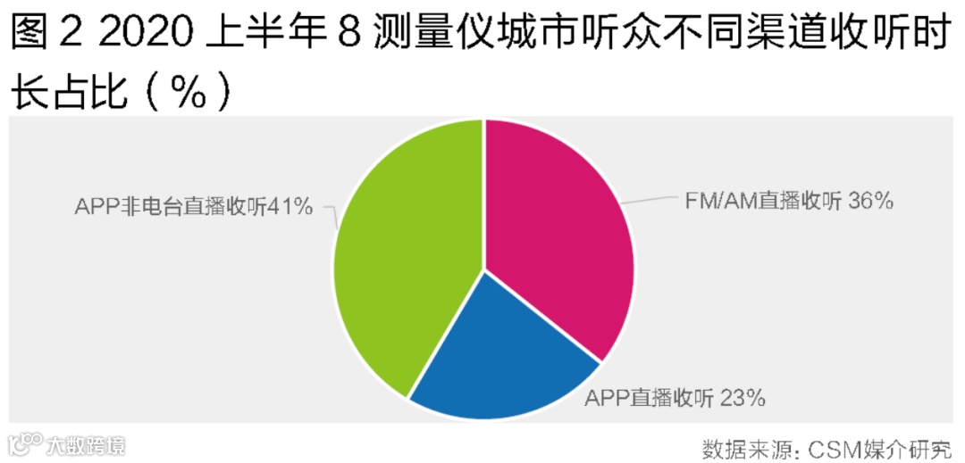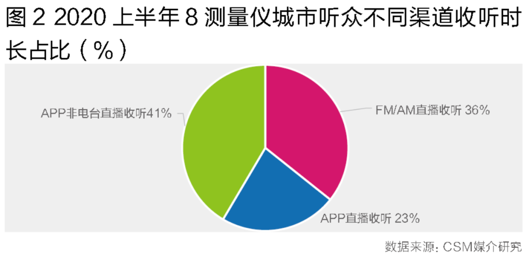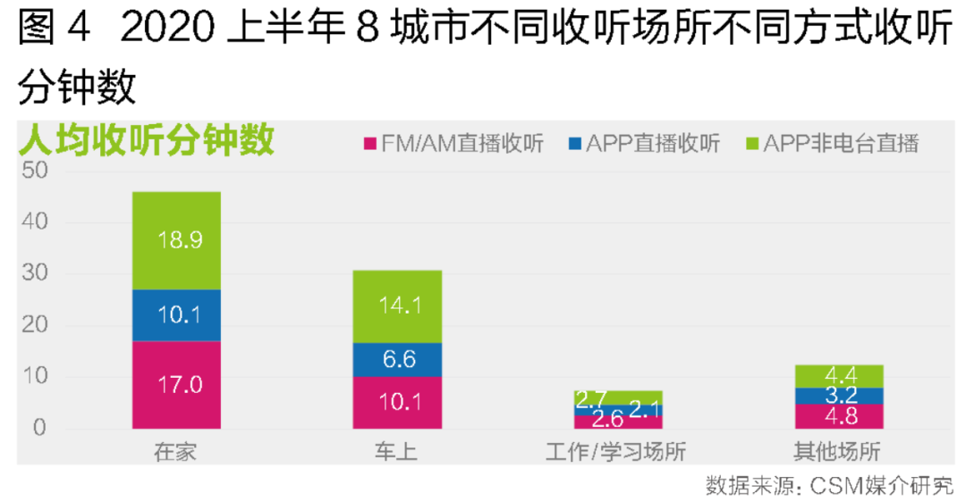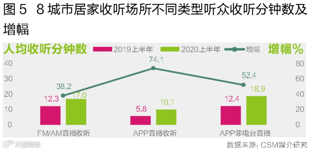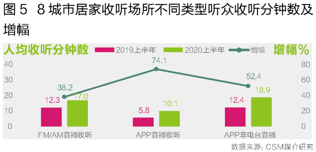 受到疫情因素的影响,居家收听量大幅增长,收听总量同比增幅50.8%。其中FM/AM直播收听同比增长38.2%,APP直播收听同比大幅增长74.1%,APP非电台直播内容收听同比增幅52.4%(图5)。