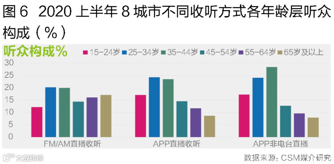 在FM/AM收听广播直播的方式中,既包含中青年听众更多使用的车载电台收听场景,也包含老年听众更为习惯的听收音机居家收听场景,因此在年龄分布上相对均衡。而使用手机APP收听直播和点播音频内容的听众则明显呈现年轻化的趋势,80后、90后这些伴随互联网成长起来的人群更快地接受了使用手机收听音频内容的方式(图6)。其中大学及以上学历、公务员/雇员等白领、个人月收入5000元及以上的人群其听众构成都相对更高。受疫情影响,35岁及以上各年龄段人群使用APP收听音频内容的构成比例都有不同程度的增长。