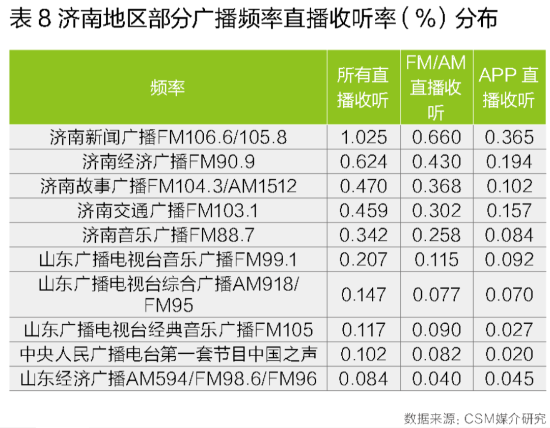 济南地区听众收听的主要直播频率中,济南新闻广播在FM/AM直播收听和手机APP直播收听中竞争优势明显。除山东经济广播来自APP的比例达到54%外,其他各主要频率来自APP直播收听的比例相比其他城市略低,普遍在30%左右(表8)。