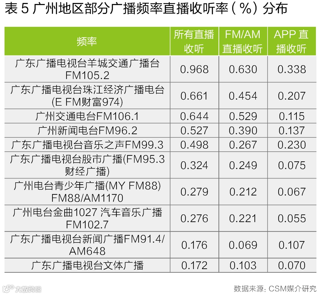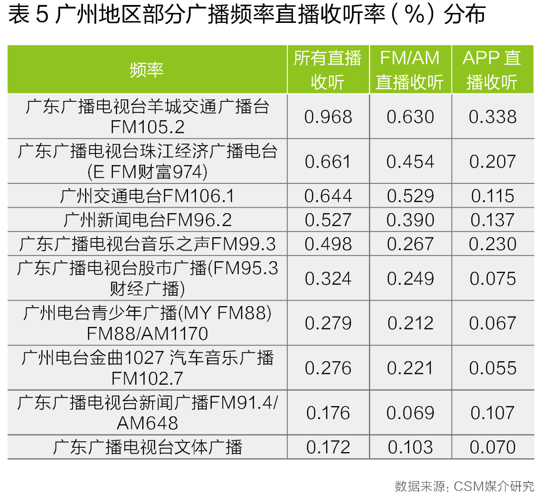 广州地区听众收听的主要直播频率中,广东羊城交通广播在FM/AM直播收听和手机APP直播收听中都有较强的竞争优势。广东广播电视台新闻广播来自手机APP的比例达到61%(表5)。