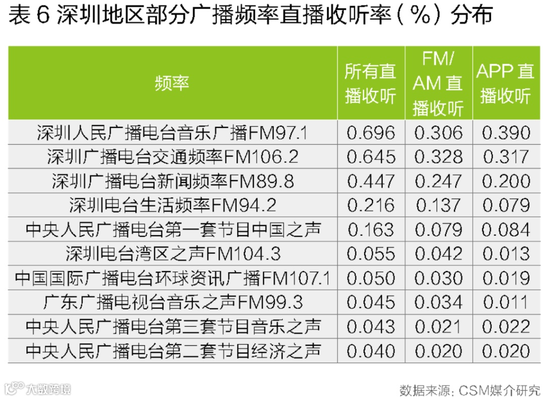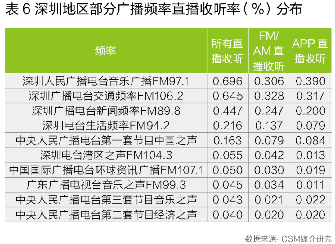深圳地区听众收听的主要直播频率中,深圳交通频率在FM/AM直播收听中占据领先位置,但深圳音乐广播凭借在手机APP直播收听中的优势反超。此外,中央人民广播电台的几个频率在FM/AM直播收听和APP直播收听的表现相对均衡(表6)。