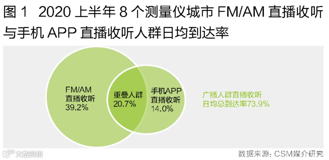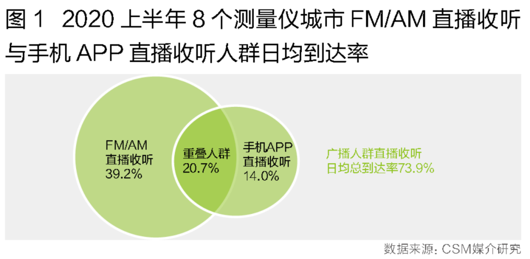 在CSM媒介研究8个测量仪调查城市的广播听众中,平均每天收听广播直播的人群占比为73.9%,其中通过FM/AM等环境音收听广播直播的日均到达率为59.9%,通过手机APP收听广播直播的日均到达率为34.7%。从广播直播节目的收听来看,每天有39.2%的听众只通过收音机、车载电台等设备收听FM/AM的直播节目,有14.0%的听众只通过手机上的APP应用程序来收听广播直播节目,而有20.7%的听众在一天中会同时使用收音机和手机APP来收听直播节目(图1)。这类重叠人群会在不同场景接入不同的收听渠道,比如在上下班的途中使用车载电台收听,而在家中或者工作学习场所则用手机应用程序收听。与去年下半年相比,复合使用不同设备收听直播内容的人群有所增长,每天只通过单一途径收听直播内容的听众比例都有所下滑。