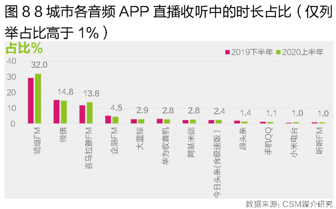 在8城市收听广播直播内容的听众中,今年上半年,蜻蜓FM、微信和喜马拉雅FM三个APP的收听时长占比最高,分别为32%、14.8%和13.8%。相比2019下半年,蜻蜓FM和喜马拉雅FM的时长占比分别增长了2.7%和2.0%,而微信、企鹅FM、趣头条等APP的时长占比均略有下滑。