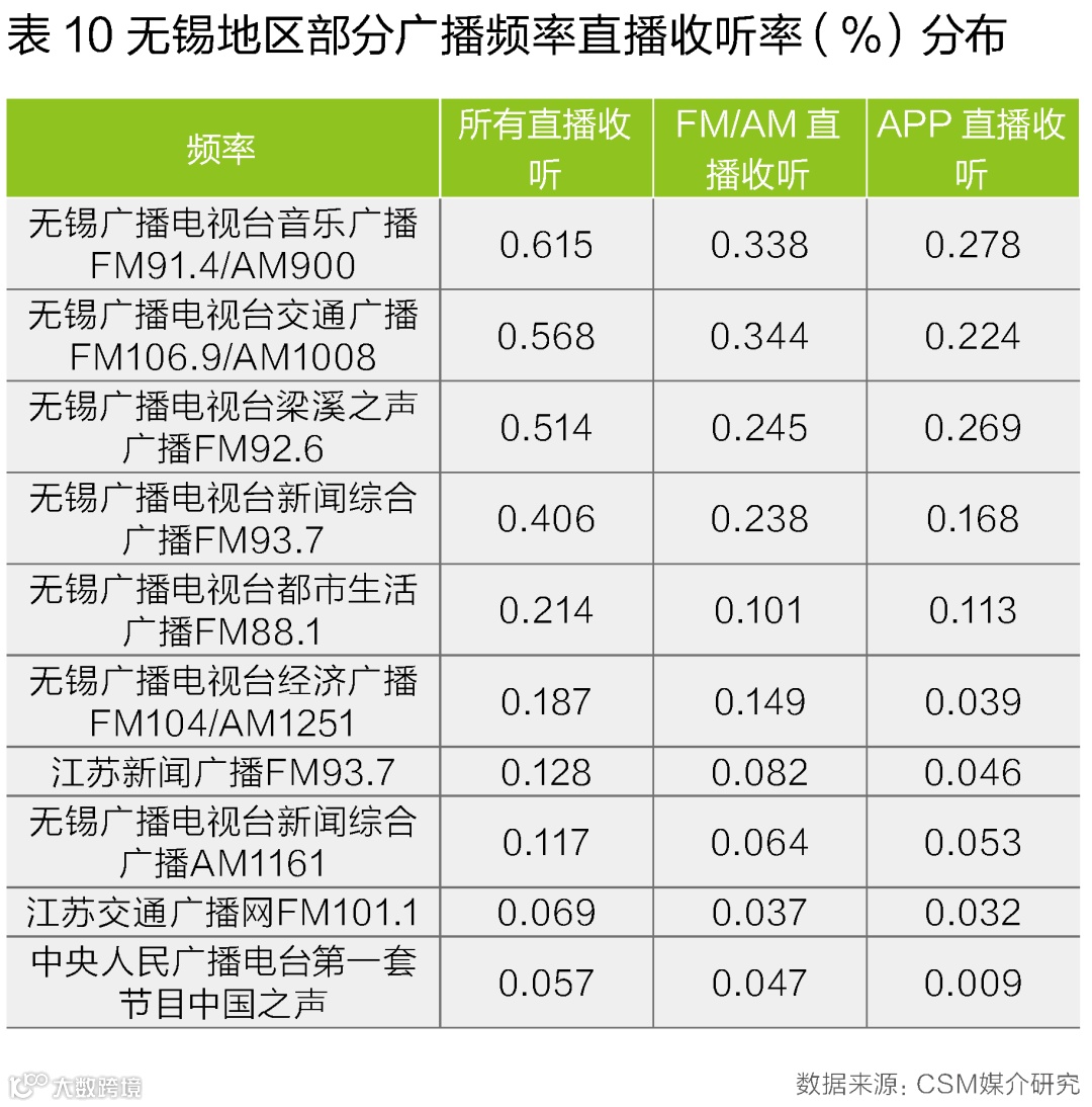 无锡地区听众收听的主要直播频率中,无锡交通广播在FM/AM直播收听中处于领先位置,但在手机APP直播收听中,无锡音乐广播和无锡梁溪之声广播都超过了无锡交通广播。各主要频率中,无锡都市生活广播和无锡梁溪之声广播来自手机APP的比例分别为53%和52%(表10)。