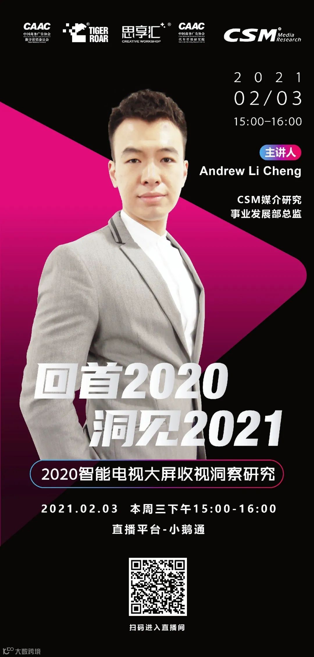 2021年2月3日15:00-16:00,在CSM与中国商务广告协会数字营销委员会联合举办的线上直播中,将由CSM媒介研究事业发展部总监Andrew Li Cheng为您带来《2020智能电视大屏收视洞察研究》,期待您的参与!