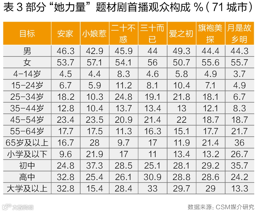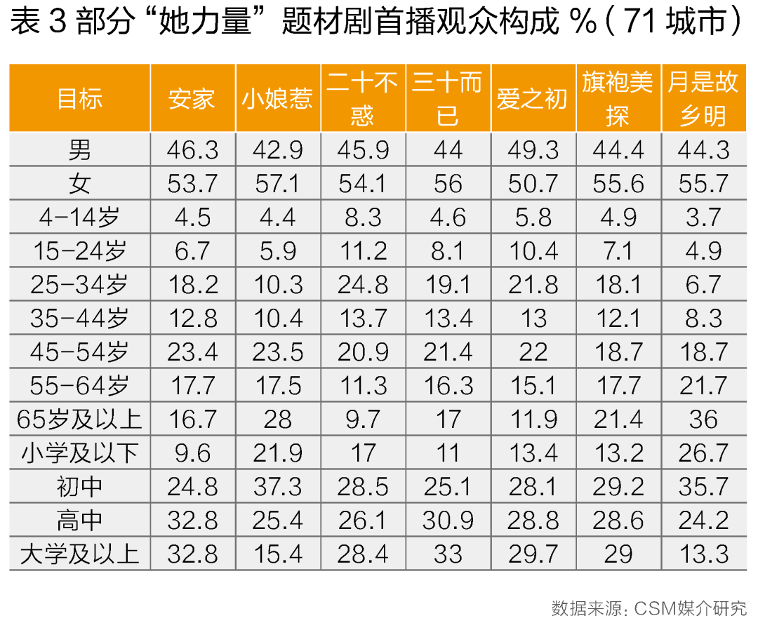 三是不同题材的女性剧目,可以满足不同教育程度的观众需求。如《安家》和《三十而已》在大学及以上观众中的构成比例最高,分别为32.8%和33%;《小娘惹》和《月是故乡明》更受初中教育程度观众的青睐,比例均在35%以上;《二十不惑》《爱之初》和《旗袍美探》则更为大众化,在初中、高中、大学及以上观众中的占比分布十分均匀。