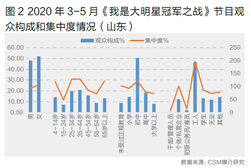 从地面频道来看,山东综艺频道《我是大明星冠军之战》是地面频道中最早采用“云录制”完成全流程歌唱类综艺节目的团队。节目中除了演播室主持人与各地的评委、艺人连线交流外,技术部门实现了异地声音同步传输的技术,最终解决了演播室播放音乐、歌手异地接受音乐的网络延迟、多人异地合唱等一系列难题。从节目观众构成方面看,女性、25-44岁、初中学历、工人职业的观众比例突出;而从观众集中度方面看,除了和观众构成浮动相似的几个条件外,65岁以上观众集中度的高达122%,一定程度说明采用“云录制”的节目虽然融合了一些新技术和新形式,但老龄观众对节目的关注度并未受到影响。
