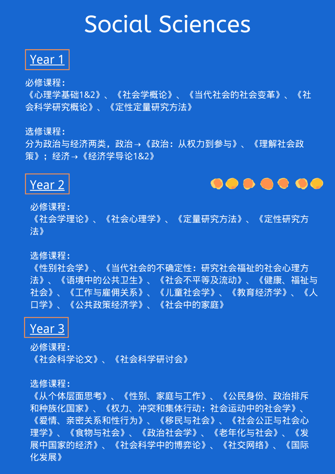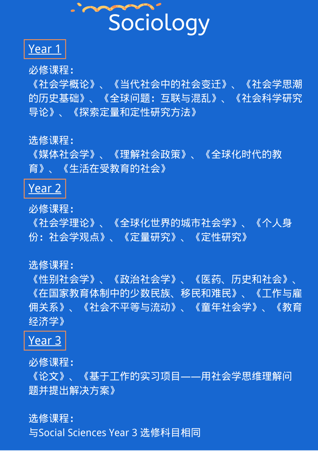 从课程安排上我觉得Sociology与Social Sciences十分相似,但Sociology侧重于社会学理论,Social Sciences偏向社会学与心理学的结合。(大家自行判断!)