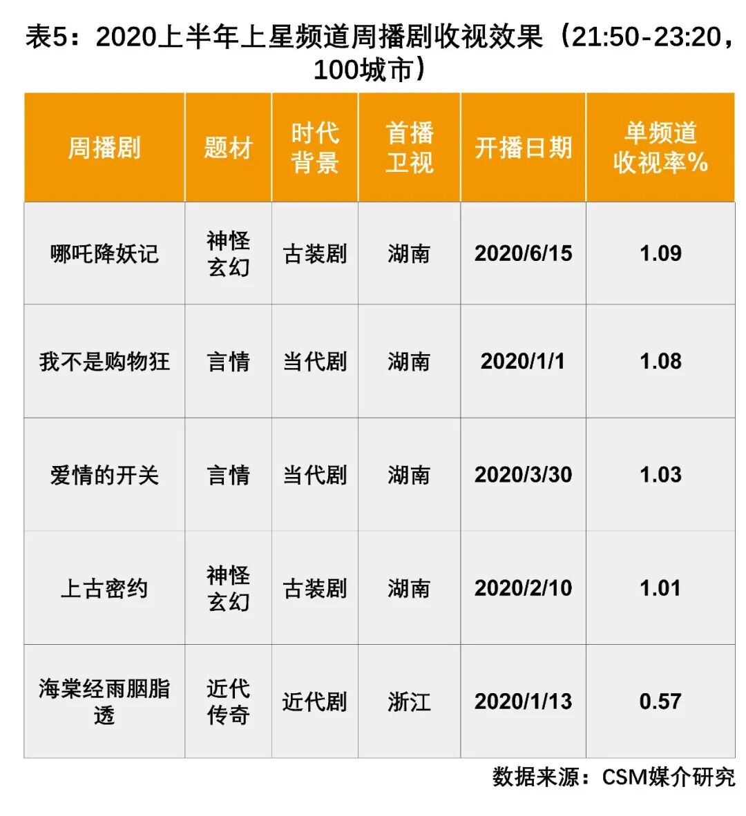 周播剧的收视率随着整个收视环境的好转而水涨船高,加上湖南卫视多年来一直坚持在该领域深耕,共有4部剧单频道收视率超过1%。描绘“买买买”女孩成长的言情剧《我不是购物狂》单频道收视率达到1.08%,针对暑期档投放的神怪玄幻剧《哪吒降妖记》收视率冲到1.09%,言情剧《爱情的开关》和神怪玄幻剧《上古密约》收视率也均突破1%。然而周播剧和首轮剧相比,整体品质上还有待提升,当代剧中存在一定的悬浮现象。