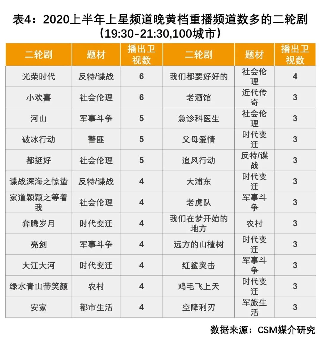 今年上半年上星频道晚黄档,首轮新剧和二轮剧的占比已经构成了“二八格局”。至少36家卫视晚黄档播出了二轮剧,以二三四线卫视为主,福建海峡电视台、厦门、河南、云南等省级卫视均不低于10部;广西、陕西、山西、内蒙古、四川、贵州、江西、辽宁等省级卫视均播出9部左右,西藏二套、重庆、兵团、甘肃、天津、山东、新疆、吉林、安徽、广东、宁夏等省级卫视播出8部左右。一线卫视中,中央台八套也重播了2部台内首轮剧《奋进的旋律》和《大浦东》。