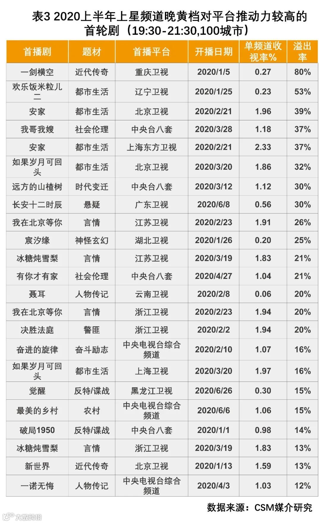 除了上面佼佼者,还有一部分电视剧虽然收视不够闪亮,却是频道功臣,对于所播平台起到巨大的拉升作用,例如默默无名的《一剑横空》《欢乐饭米粒儿二》在播出平台溢出率均超过50%。今年上半年,上星频道晚黄档首轮剧超过一半(35部次)拉升了频道均值,其中,有23部次溢出率超过10%,有15部次溢出率超过20%,有8部次超过30%。