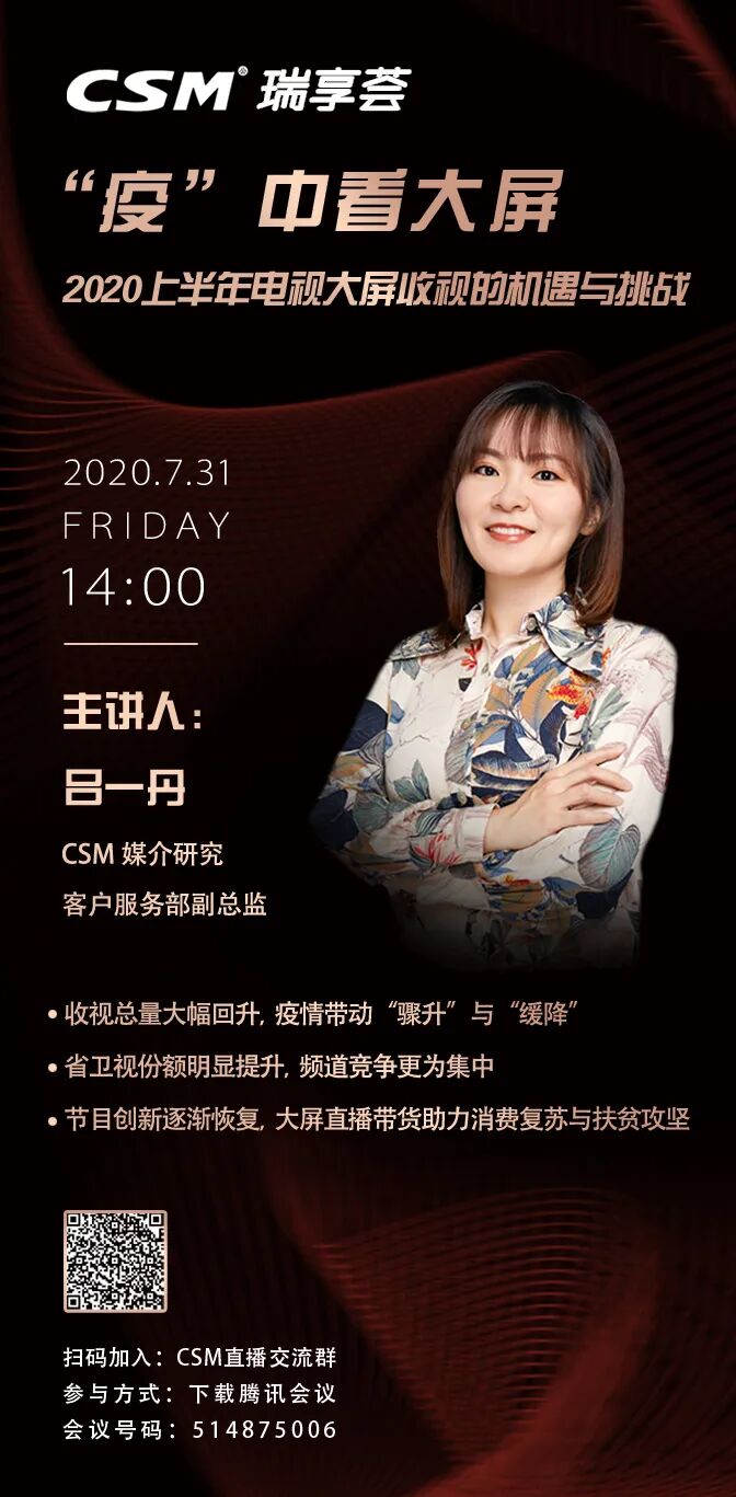 2020年全国人民在疫情和“抗疫”之间斡旋,并在其陪跑之下历经半载。“疫潮”褪去留下的不止有待启的市场还有被疫情改变的受众收视行为。在此,中国广视索福瑞媒介研究(CSM)举办CSM瑞享荟线上直播,由客户服务部副总监吕一丹,为您梳理2020年上半年电视大屏的收视变化,并探讨其中的机遇与挑战。2020年7月31日(本周五)下午14:00,相约CSM瑞享荟,不见不散!