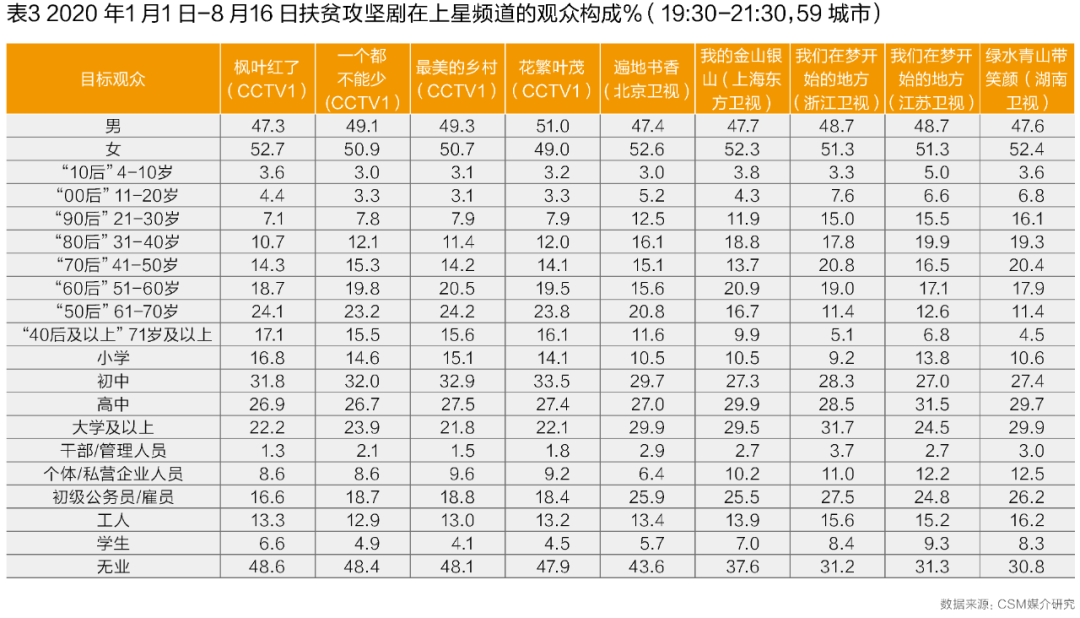 扶贫剧拥有哪些重度观众?从已播扶贫剧观众性别构成来看,9部次中有8部次的女性观众占比更大,《枫叶红了》《遍地书香》《我的金山银山》《绿水青山带笑颜》这4部剧在所播卫视平台的女性观众构成均超过了52%,唯独《花繁叶茂》在中央电视台综合频道的男性观众占比略高(51%)。