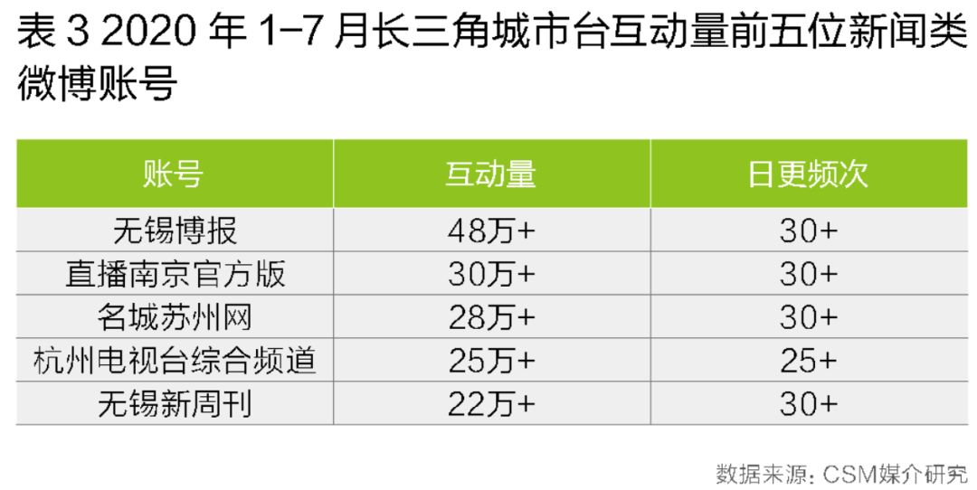 长三角城市台新闻类微博账号向头部集中的趋势更为显著。互动量前五的微博账号即占据长三角整体市场八成的互动量。这五个账号包括无锡台“无锡博报”、南京台“直播南京官方版”、苏州台“名城苏州网”、杭州台“杭州电视台综合频道”、无锡台“无锡新周刊”。这几个账号日常维持着每日25-30篇以上的高发布量,2020年1-7月总互动量在22-48万之间(表3)。