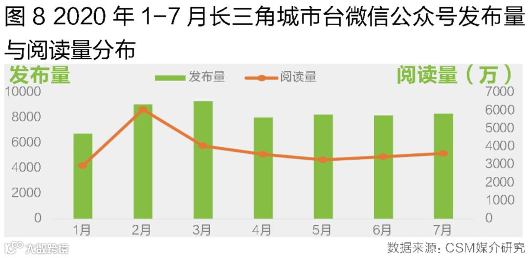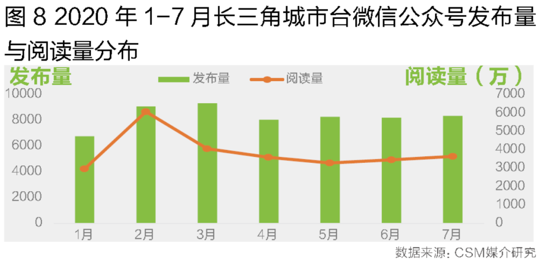 长三角城市台微信公众号总体发布量稳定,11个台70个微信公众号,2020年1-7月共发布近6万篇文章,日均发布量273篇。累计获得超过2.7亿阅读量,日均阅读量超过120万次。疫情爆发初期微信公众号阅读量明显提升,其后逐渐回落,体现出微信公众号在特殊时期资讯服务性的特征(图8)。