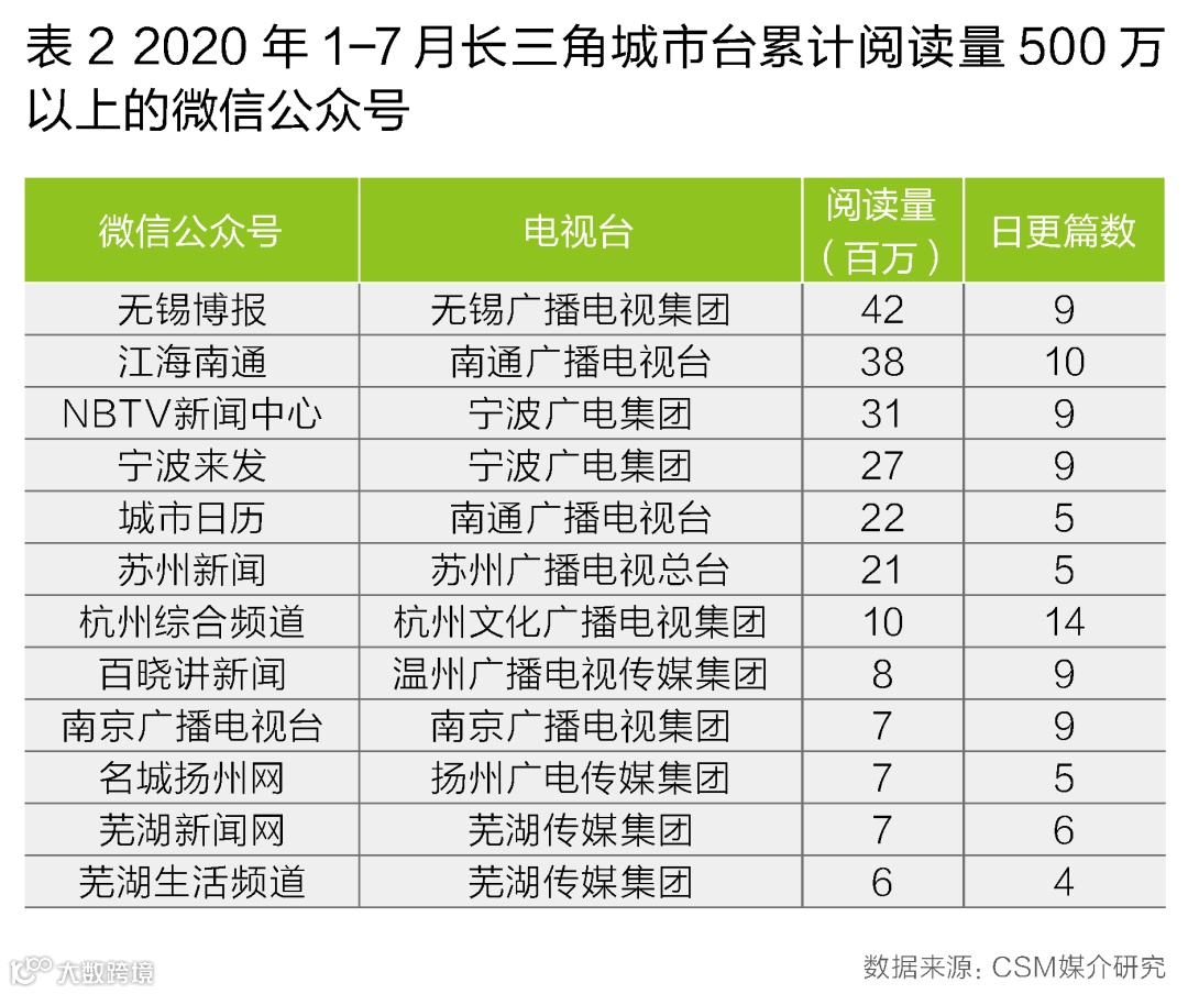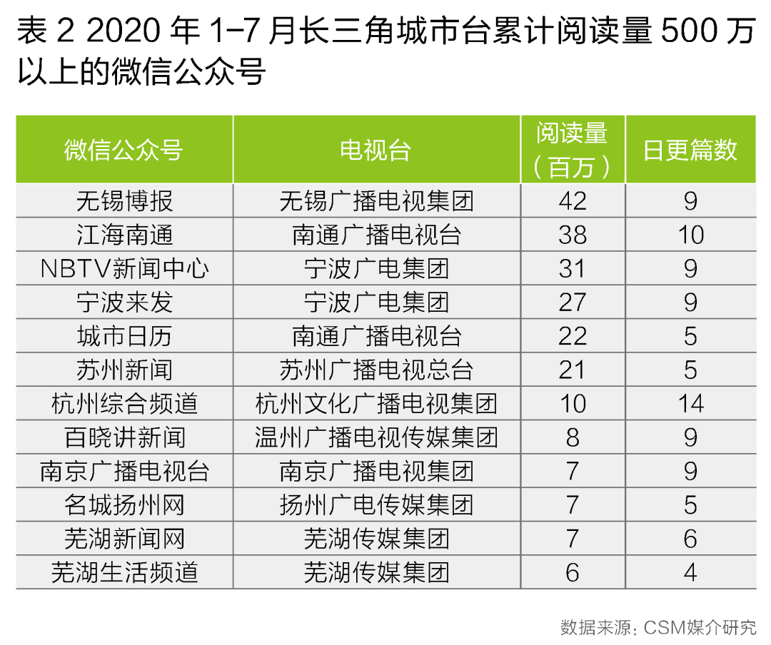 高阅读量文章更多集中在头部账号。2020年1-7月,长三角城市台共有7个新闻类微信公众号的阅读量达1000万以上,5个账号阅读量在500万-1000万之间,它们占据了长三角城市台新闻微信公众号83%的阅读量(表2)。